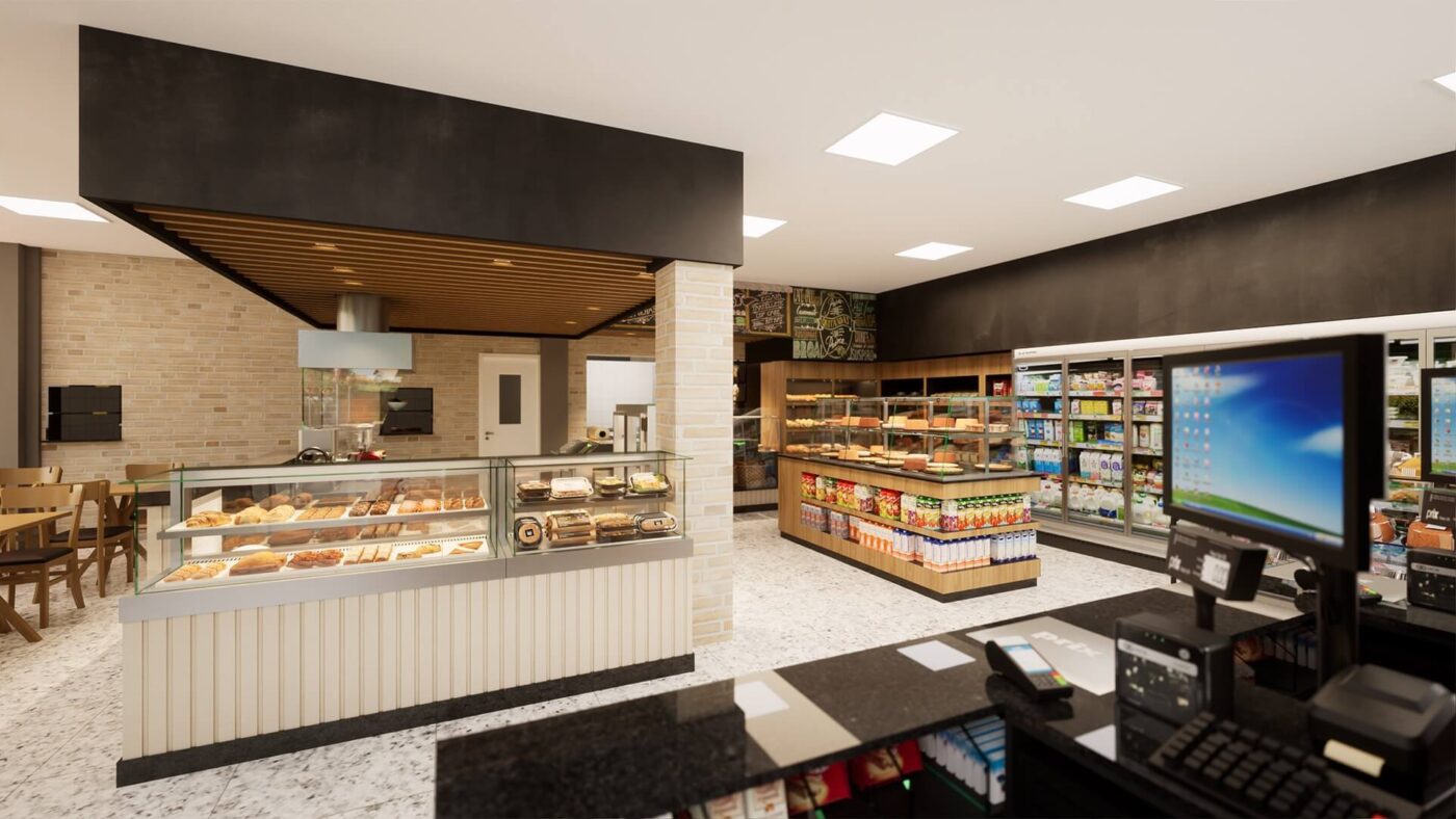 Local: Belo Horizonte. O projeto de decoração foi elaborado com base no layout discutido, fugindo um pouco da tendência do autoatendimento e focando em uma experiência objetiva entre o cliente e os produtos da casa. Dessa forma, foi necessária a implementação de uma área de consumo maior e até a criação de uma cozinha para fornecimento de pratos feitos e lanches rápidos, a fim de estimular o público no horário do almoço, que tradicionalmente é um dos horários de menor movimento em padarias.